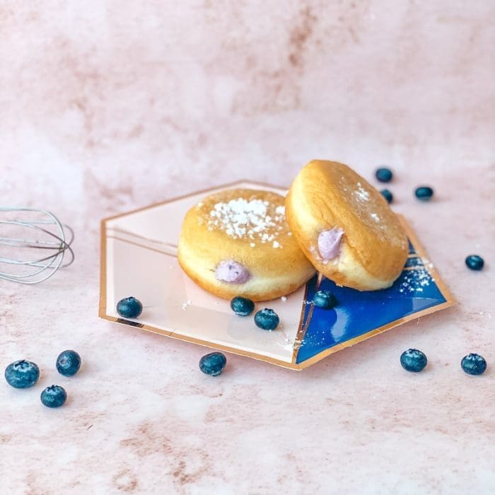 Filled with blueberry-infused cream cheese and dusted with powdered sugar.