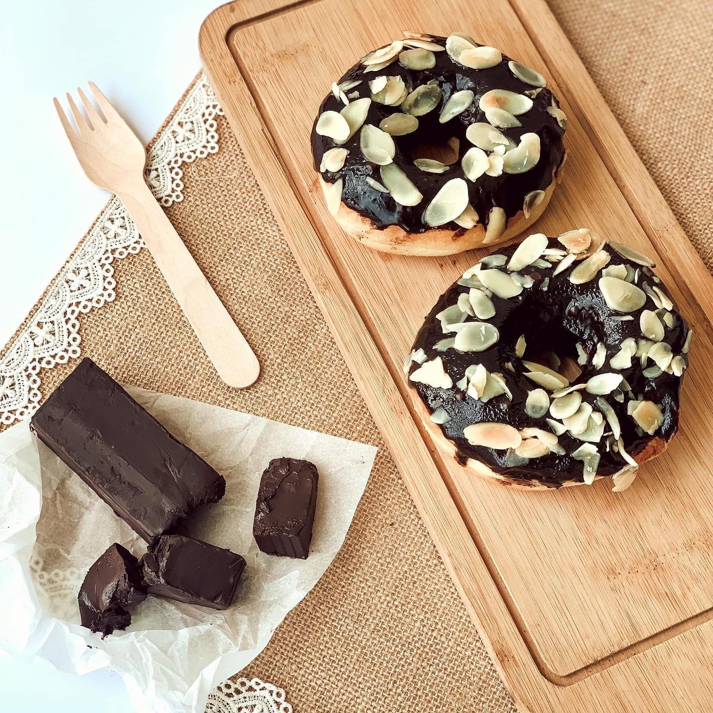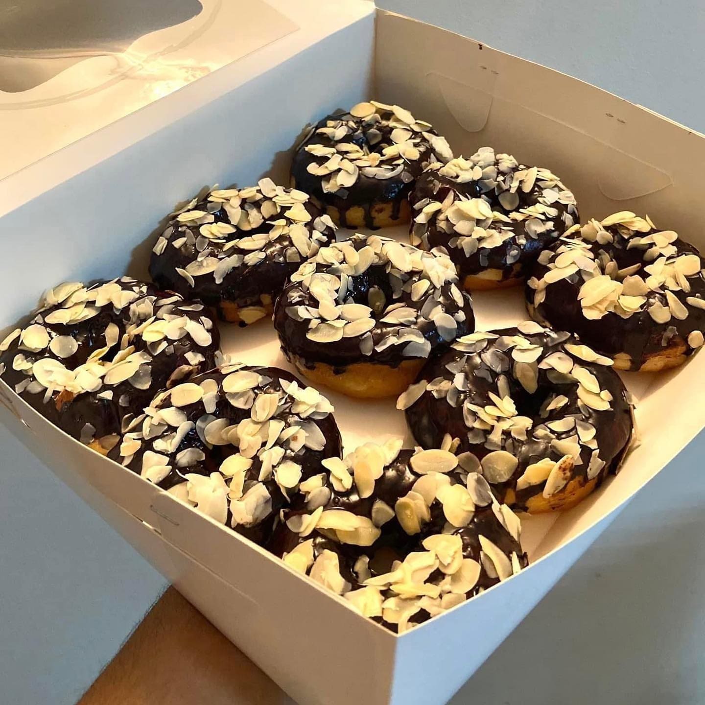 fluffy doughnuts topped with a glossy chocolate glaze and sprinkled with crunchy almond slivers for a delightful nutty twist.
