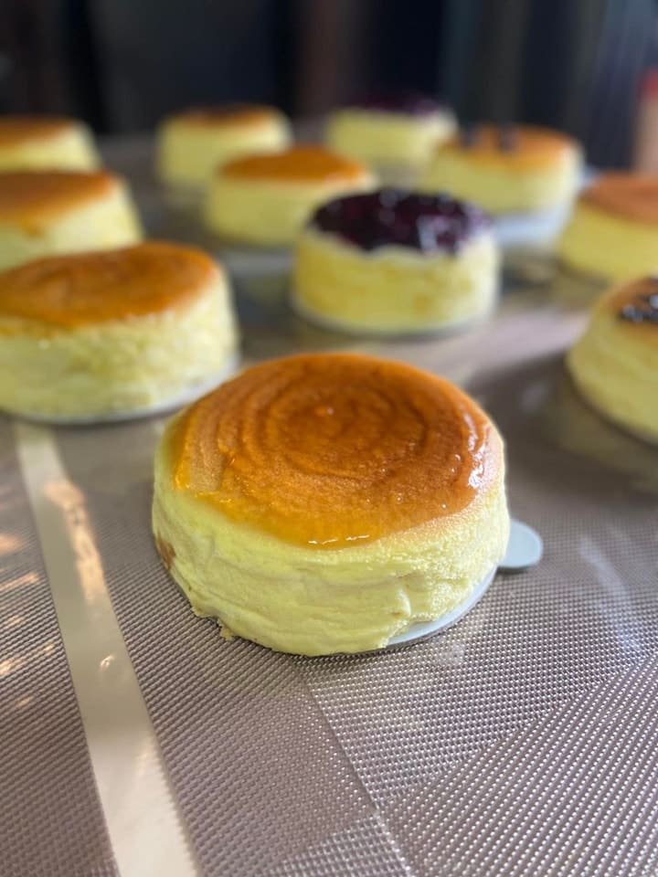A special edition of Japanese souffle cheesecake topped with cream cheese and blueberry layer.