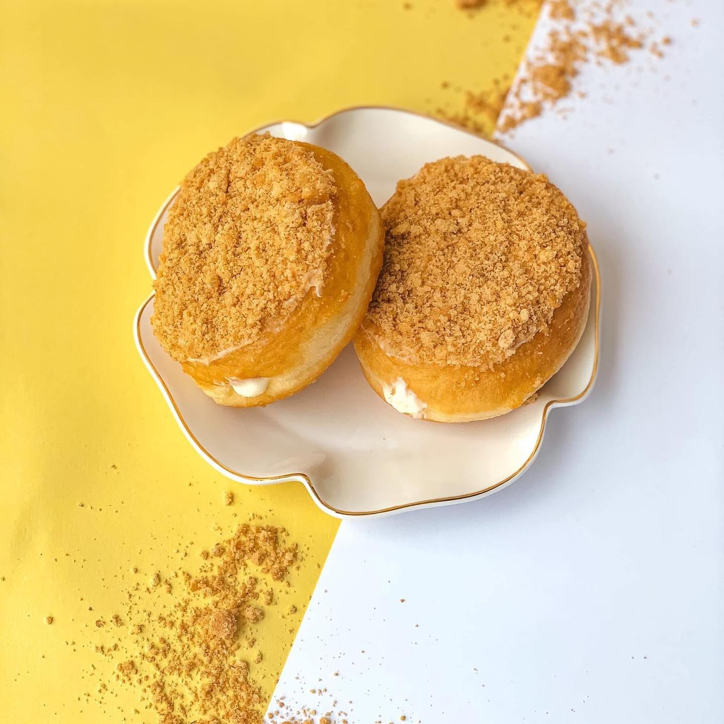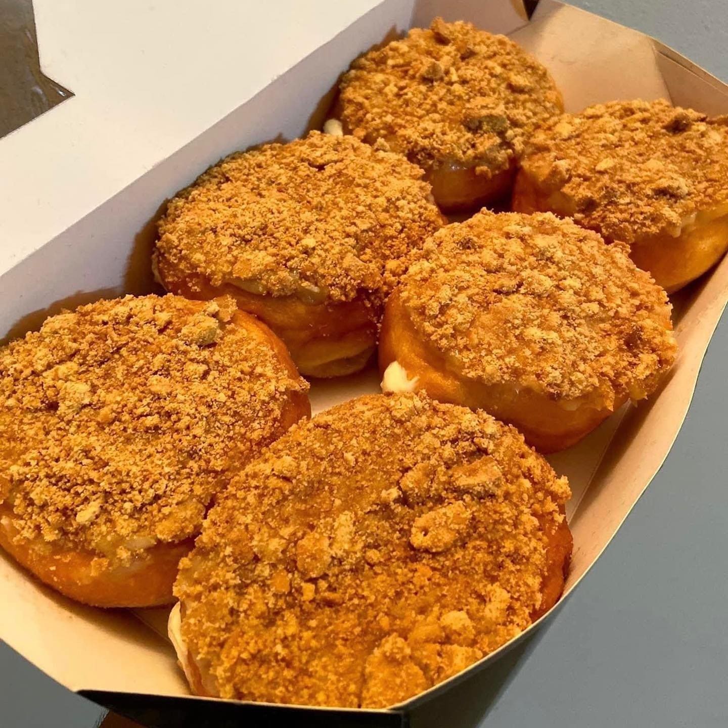 Freshly made doughnuts filled with classic cream cheese filling, topped with biscuit crumbs.