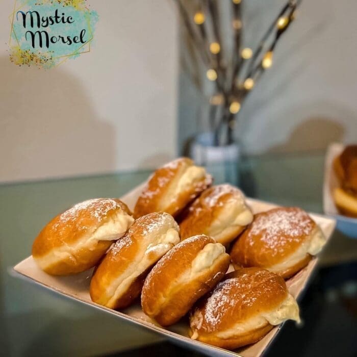 Fluffy doughnuts bursting with smooth vanilla custard cream.